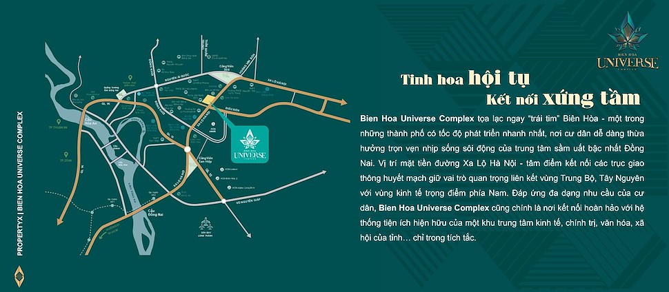 - Phồn hoa HỘI TỤ KẾT NỐI xứng tầm, Bien Hoa Universe Complex tọa lạc ngay “trái tim” Biên Hòa - một trong những thành phố có tốc độ phát triển nhanh nhất, nơi cư dân dễ dàng thừa hưởng trọn vẹn nhịp sống sôi động của trung tâm sầm uất bậc nhất Đồng Nai.